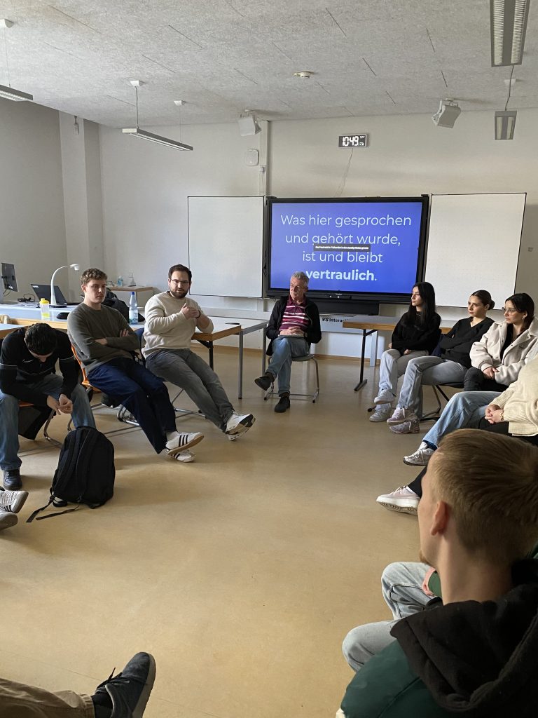 Sprechen und Zuhören nach dem Format des Vereins „Mehr Demokratie e.V.“ haben zwei Berufsschulklassen der Wilhelm-Schickard-Schule kennen gelernt und ausprobiert. Christopher Schmidhofer und Werner Hörzer waren dazu als geschulte Moderatoren der Methode in den Deutschunterricht der Berufsschüler im ersten Ausbildungsjahr gekommen und stellten den Ablauf und die Regeln für den Gesprächsverlauf vor: Sprechen in Kleingruppen von drei oder vier Personen, jede Person bekommt dreimal drei Minuten Redezeit, in den drei Runden geht es reihum in gleicher Reihenfolge. Für die Zuhörenden gilt: es sind keine Unterbrechungen und keine Rückfragen erlaubt, Pausen und Stille darf es geben, die Zuhörenden verhalten sich passiv, sollen nicht mit Nicken oder Kopfschütteln auf Aussagen der Sprechenden reagieren.