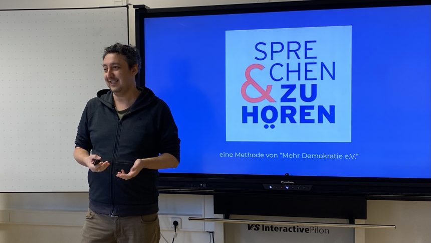 Sprechen und Zuhören nach dem Format des Vereins „Mehr Demokratie e.V.“ haben zwei Berufsschulklassen der Wilhelm-Schickard-Schule kennen gelernt und ausprobiert. Christopher Schmidhofer und Werner Hörzer waren dazu als geschulte Moderatoren der Methode in den Deutschunterricht der Berufsschüler im ersten Ausbildungsjahr gekommen und stellten den Ablauf und die Regeln für den Gesprächsverlauf vor: Sprechen in Kleingruppen von drei oder vier Personen, jede Person bekommt dreimal drei Minuten Redezeit, in den drei Runden geht es reihum in gleicher Reihenfolge. Für die Zuhörenden gilt: es sind keine Unterbrechungen und keine Rückfragen erlaubt, Pausen und Stille darf es geben, die Zuhörenden verhalten sich passiv, sollen nicht mit Nicken oder Kopfschütteln auf Aussagen der Sprechenden reagieren.
